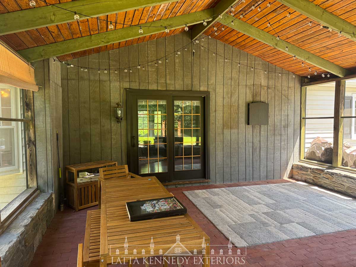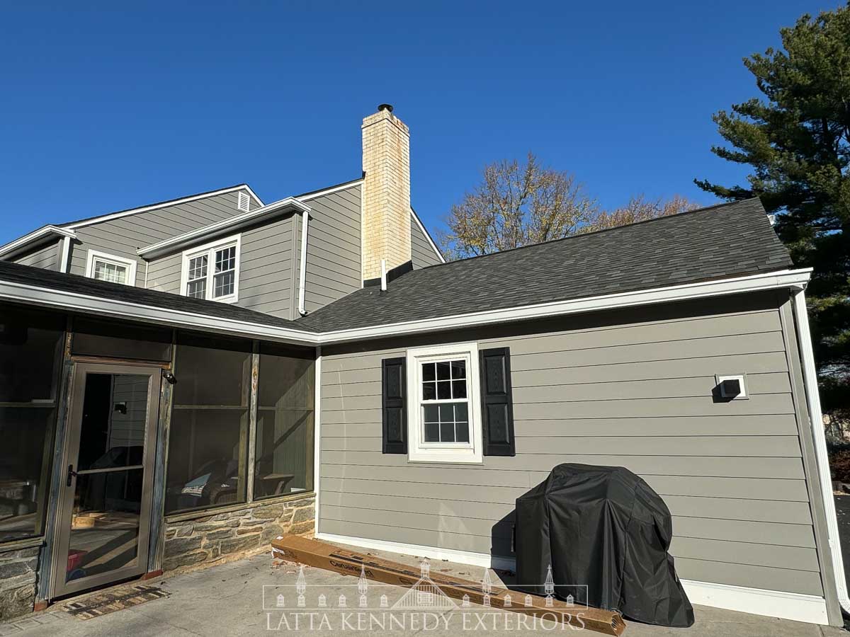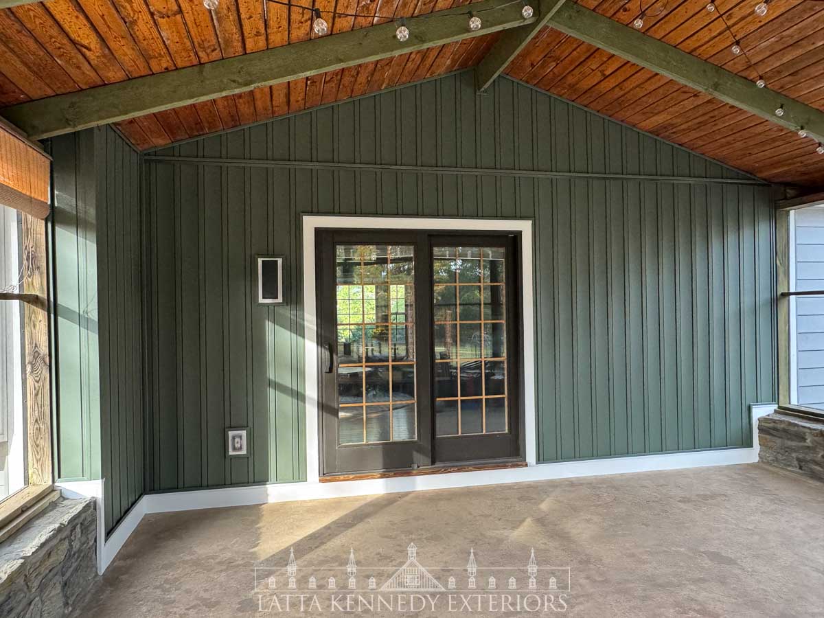 The main house received new CertainTeed Single 7” Reinforced siding in the Castle Stone color, offering long lasting performance and a clean, modern appearance. The screened porch was enhanced with CertainTeed Board and Batten siding in Forest Green, creating a beautiful contrast and adding architectural character.